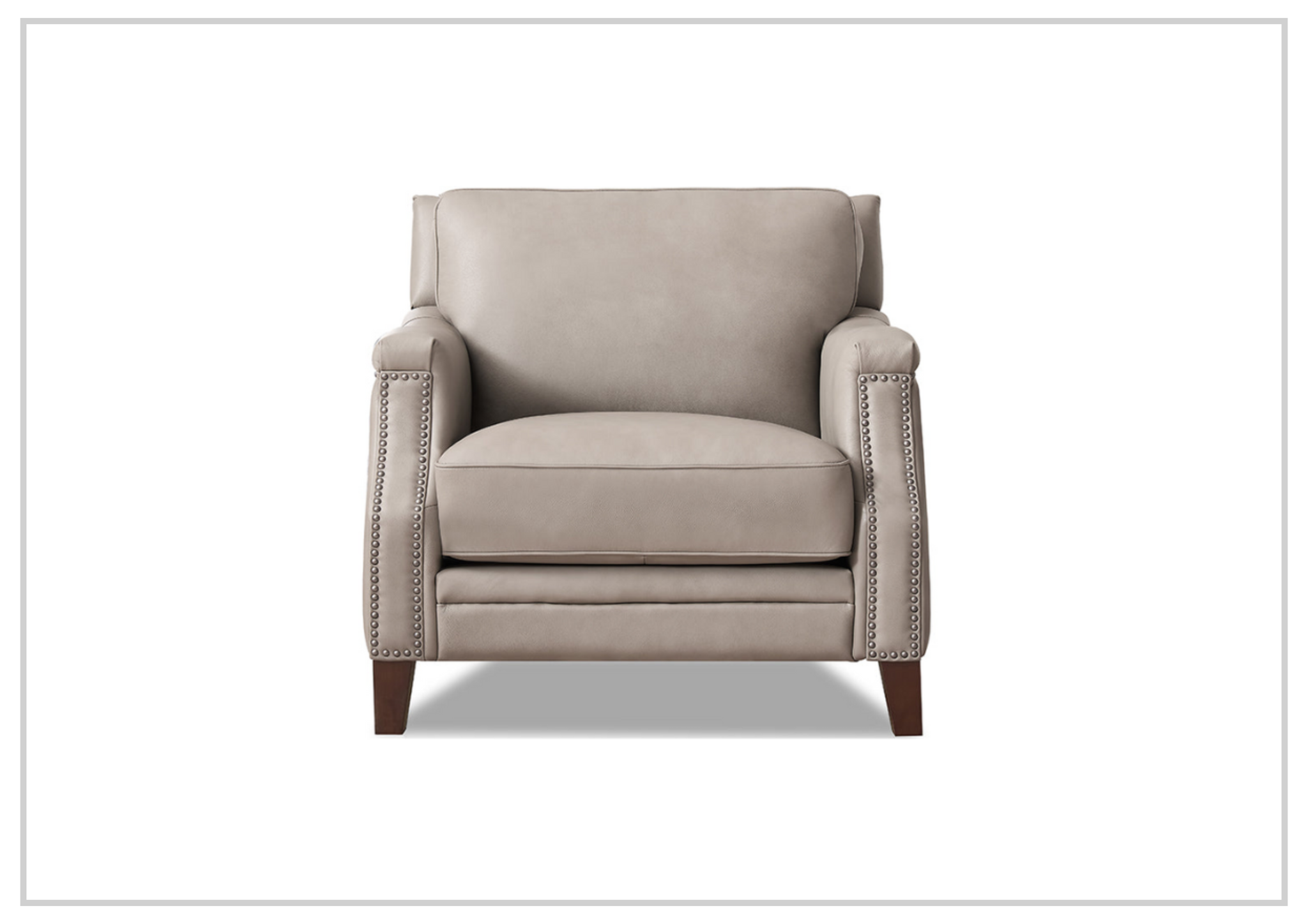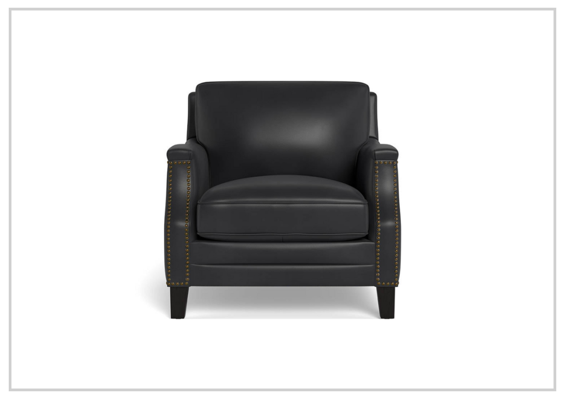 The Hydeline Camano Leather Chair is a true testament to exceptional craftsmanship and elegant design, seamlessly blending luxurious comfort with timeless charm. Its gracefully curved silhouette is accentuated by hand-applied nail-head trim that flows smoothly along the front rail and outside arms, adding a sophisticated, tailored touch. The rich, dark tapered solid wood legs complete the design, enhancing its aesthetic appeal and creating a perfect balance of style and functionality. The Camano chair is designed to make a bold statement, effortlessly fitting into both traditional and modern living spaces.