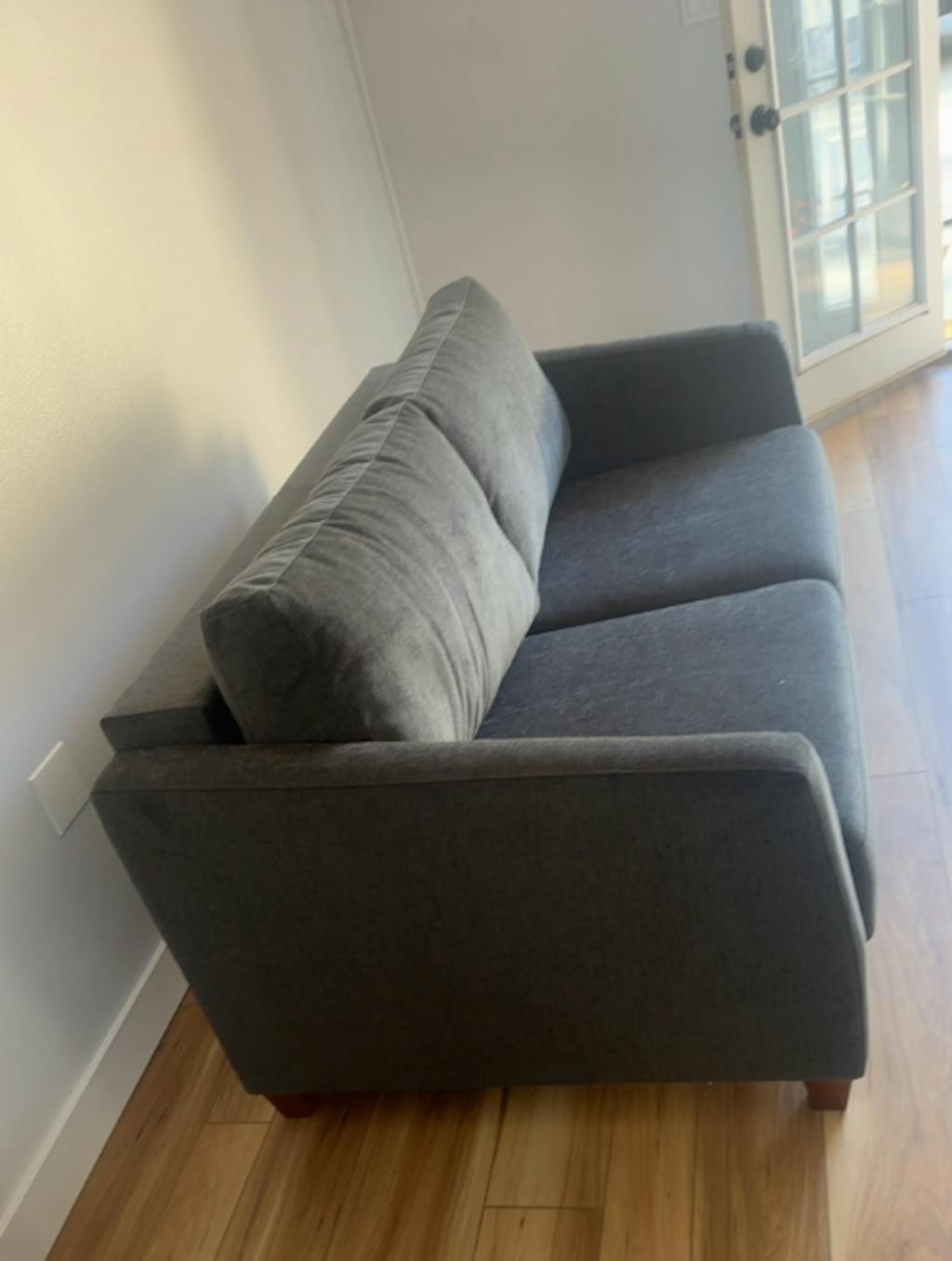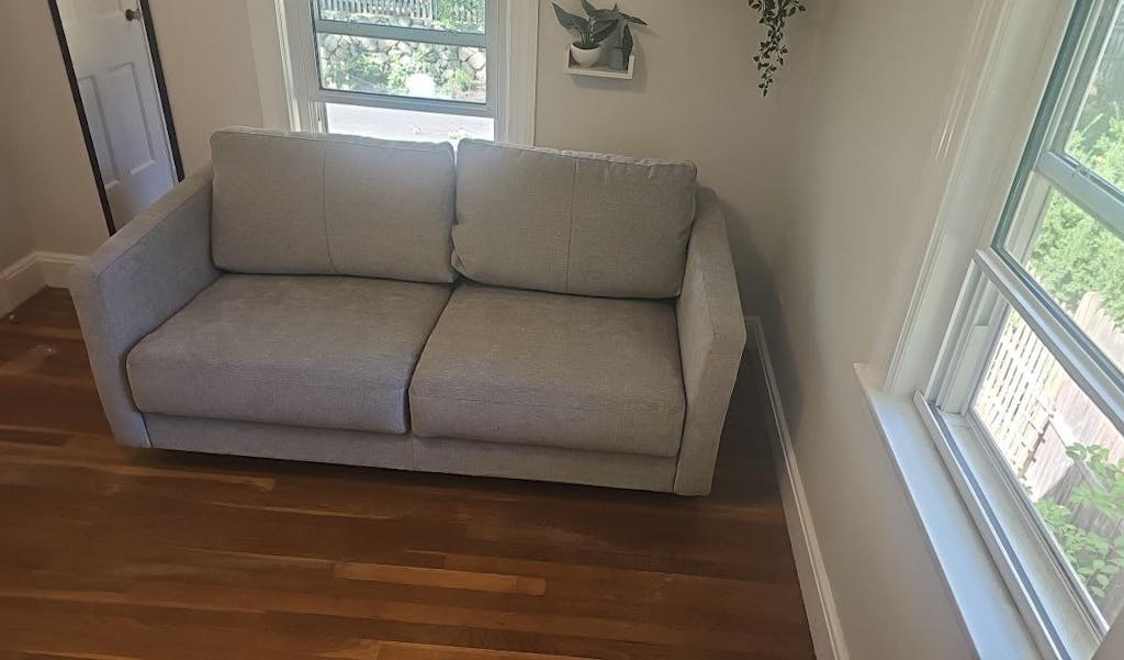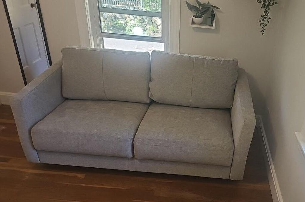 I was looking for a beige sofa which can come thru 24” doorway, should have broader arms, queen size bed, 80” + wide so that it looks nice and have good presence in the room. Took me a while but Happy to find Jamie. Love the fabric. Was ready to spent twice the amount. Mattress is very comfortable. Delivery was good and assembly hardly took 10 min. Just 4 screws to assemble back. Came thru small doors of my apt.. thank God.